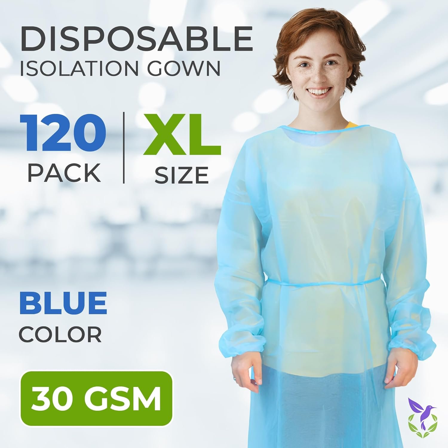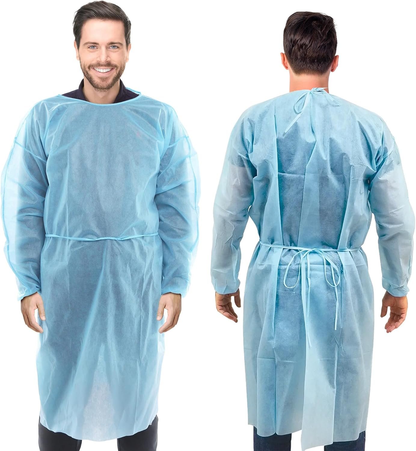 • Paquete de 5 vestidos azules de PPE desechables, extra grande. Estos vestidos de aislamiento desechables cuentan con un diseño de espalda abierta, lazos en la cintura y mangas cortas para ayudar a mantener la limpieza.