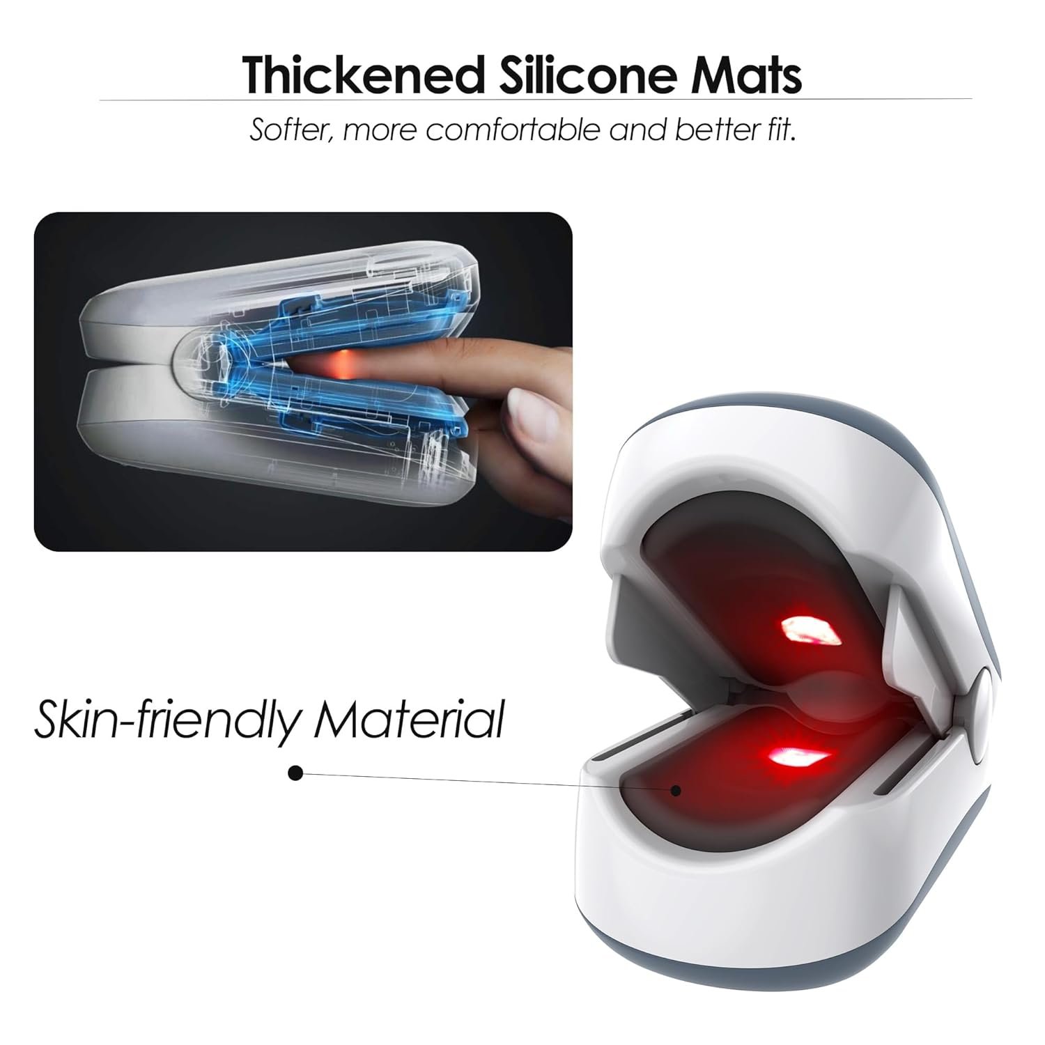 - Cámara de dedo cómoda y hipoalergénica de silicona – Con una suave cámara de dedo de silicona hipoalergénica, este oxímetro asegura un ajuste seguro y cómodo para una amplia gama de tamaños de dedo. El material de silicona sin látex es suave con la piel, reduciendo la irritación potencial y asegurando lecturas precisas cada vez