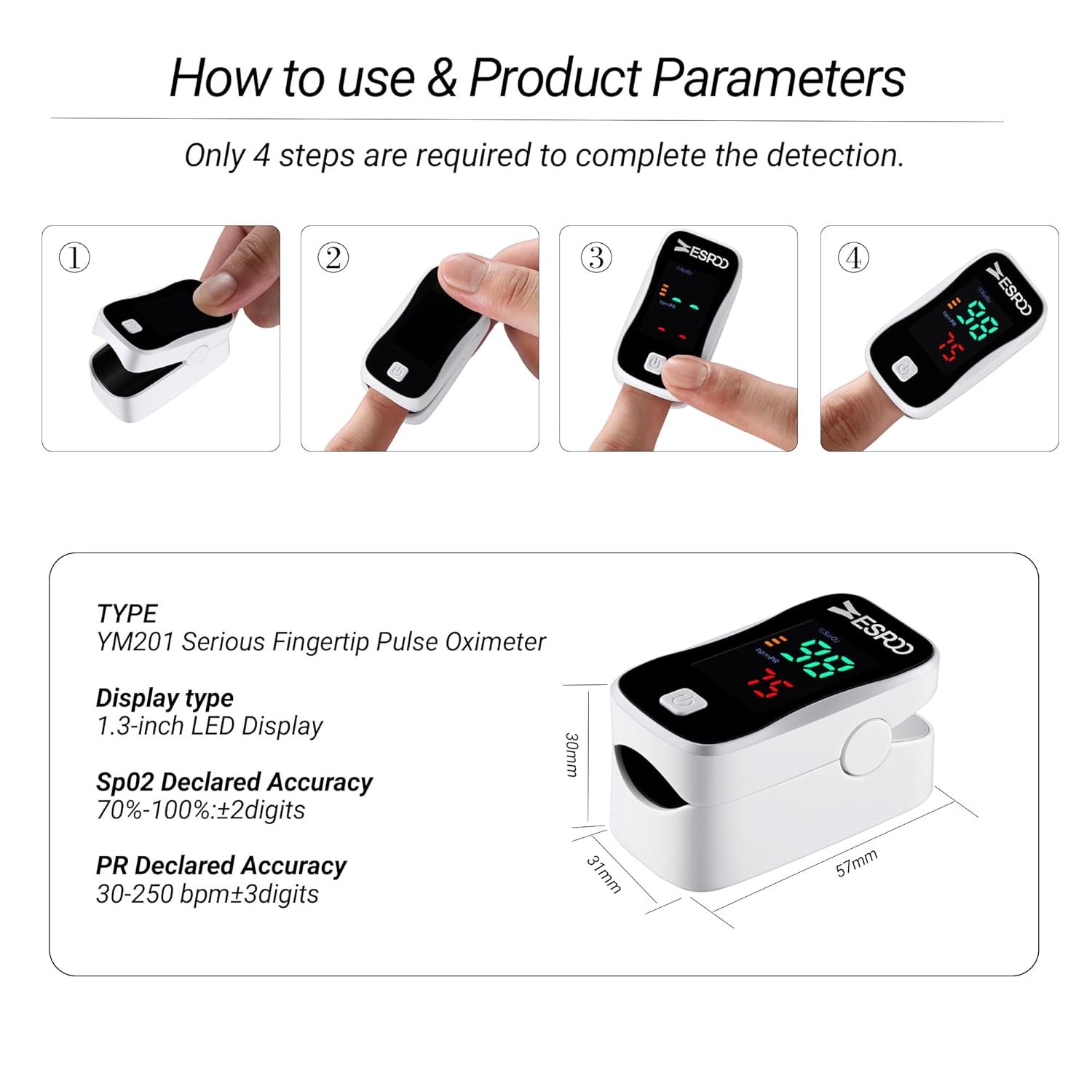 - Pantalla LED de 1.3″ de fácil lectura: nuestro monitor de oxígeno cuenta con una pantalla LED clara y brillante para una fácil lectura de SpO2, frecuencia de pulso y más, incluso en entornos con poca luz