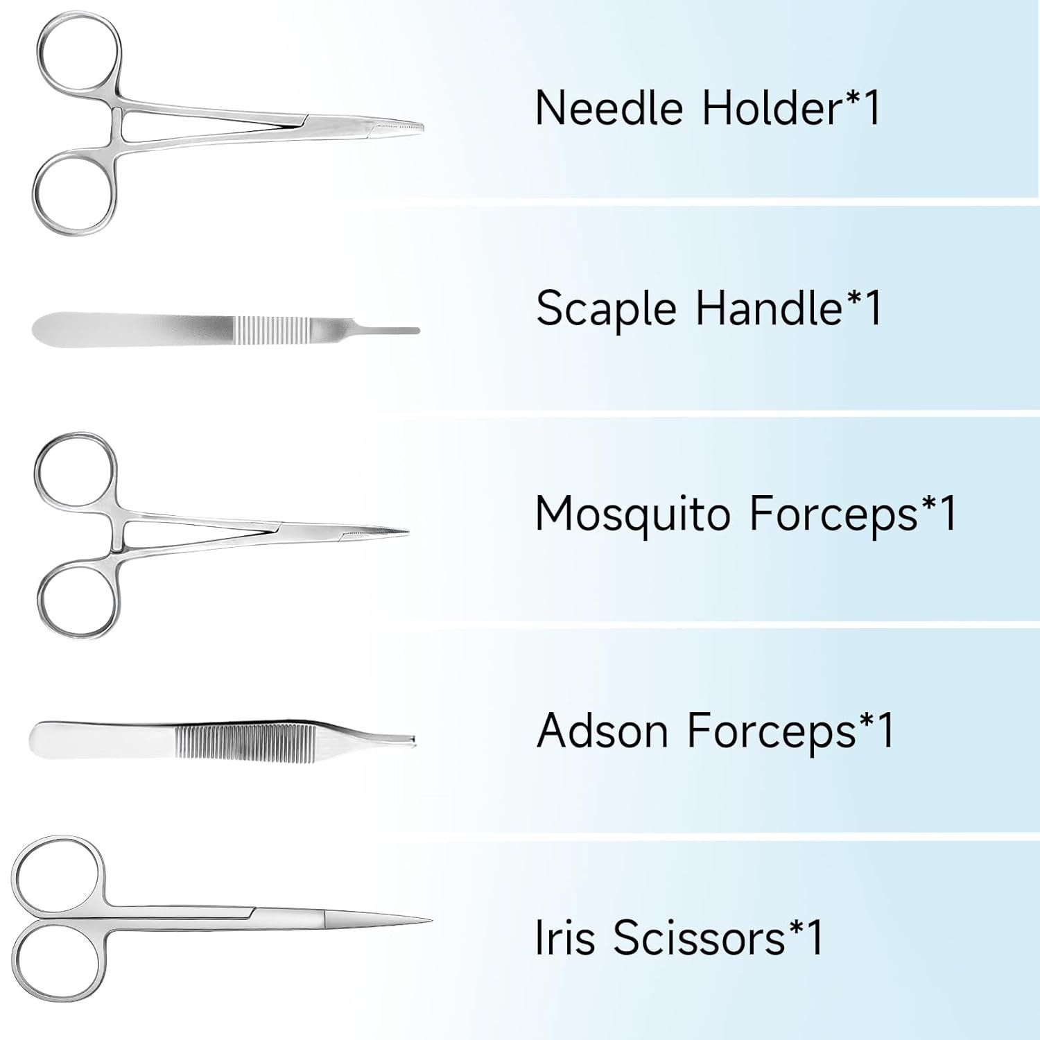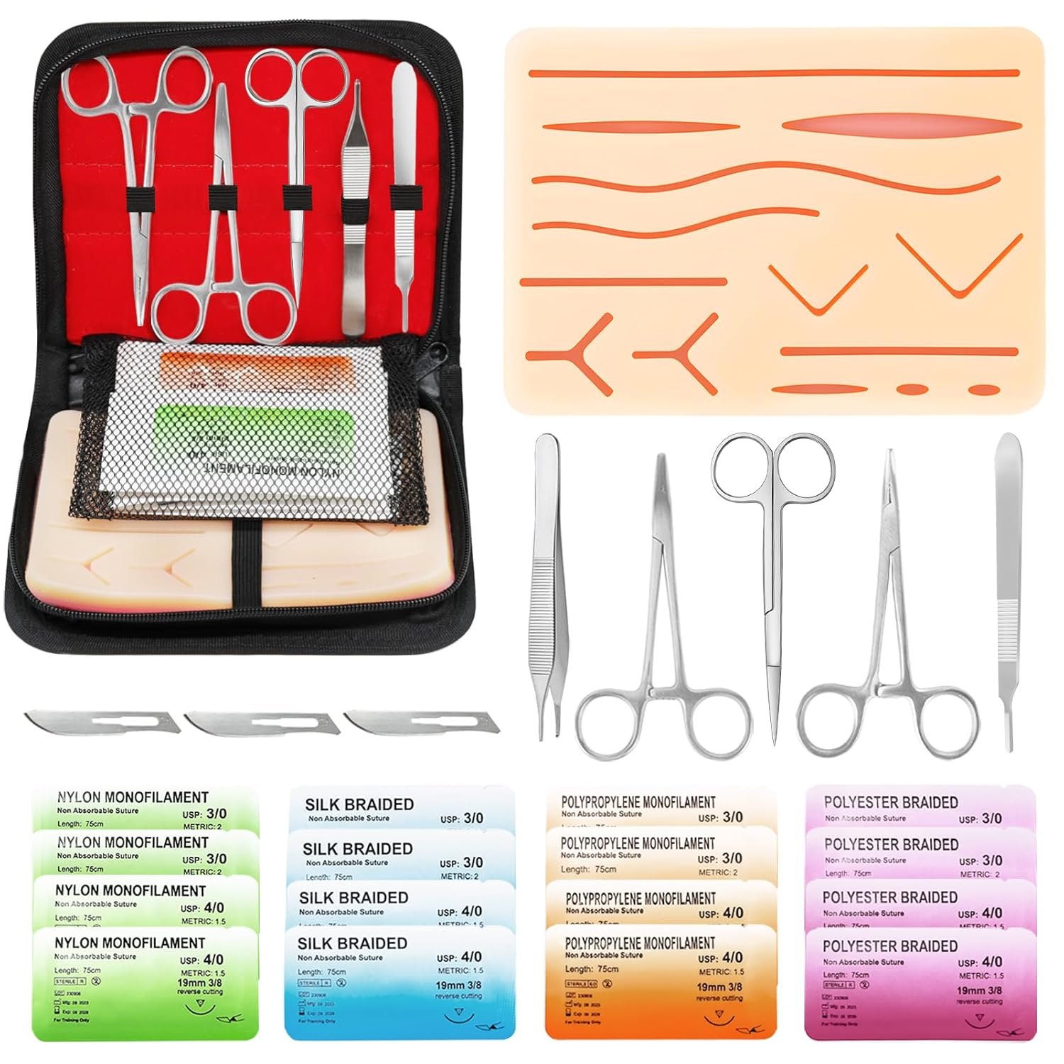- Kit de práctica de sutura todo en uno para entrenamiento realista: nuestro completo kit de sutura incluye todo lo que necesitas para practicar habilidades esenciales de sutura: un soporte de aguja, pinzas Adson, pinzas para mosquitos, tijeras iris/quirúrgicas, mango de bisturí, 3 cuchillas de bisturí #10, una almohadilla de sutura de silicona y 16 suturas no absorbibles (seda, nailon, poliéster, polipropileno tanto en 3/0 como 4/0) – Todo embalado en un práctico Funda de transporte