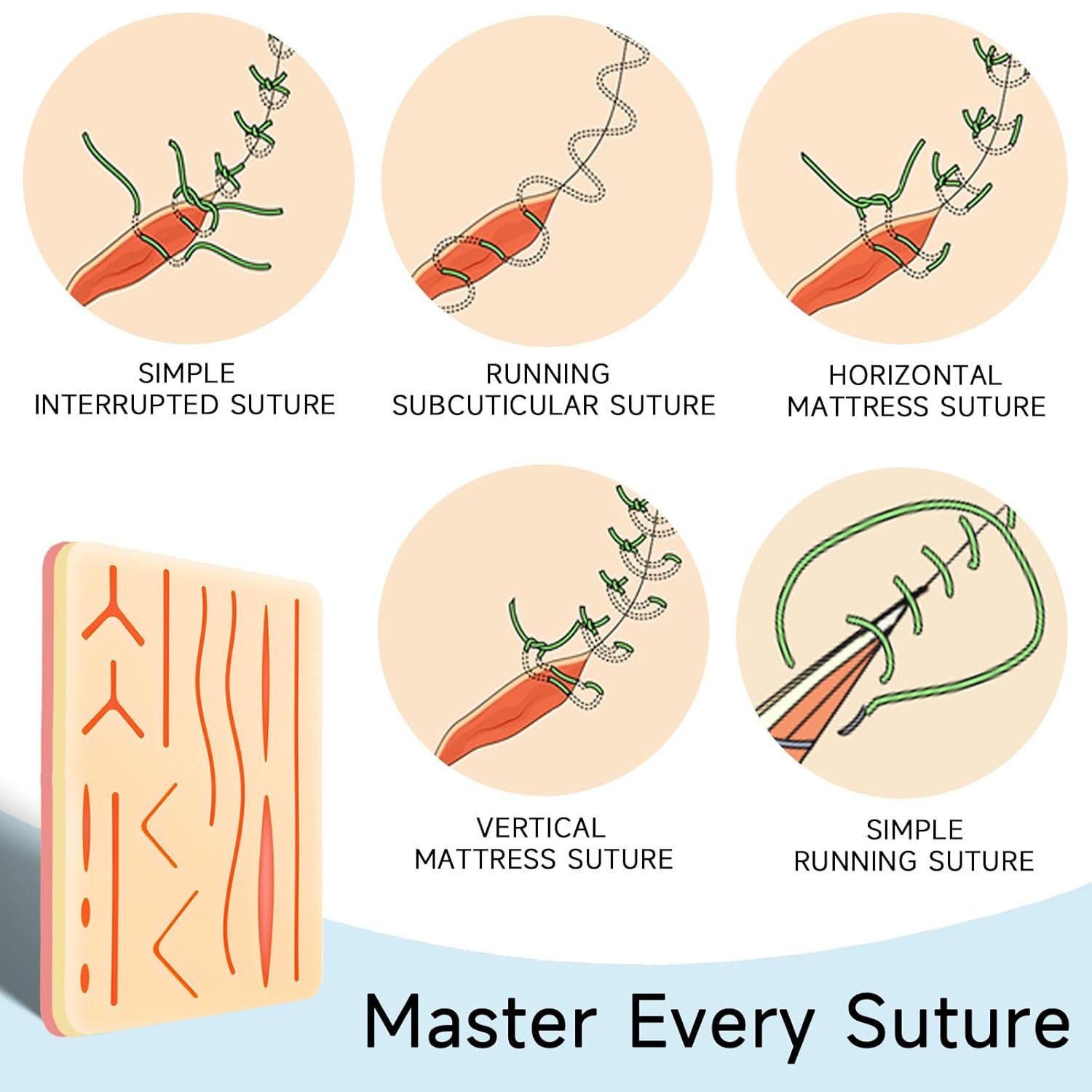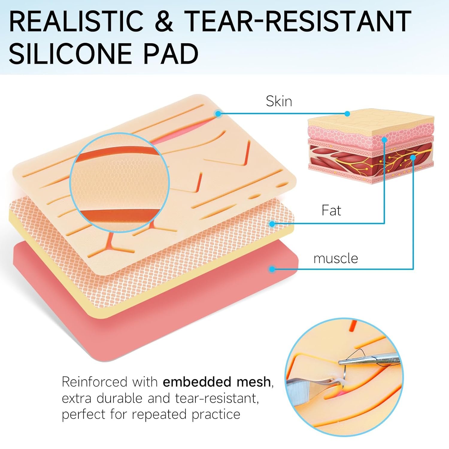 - Almohadilla de silicona ultraduradera y realista: nuestra almohadilla de silicona de 3 capas simula la piel humana, la grasa y los músculos para una experiencia de sutura realista. La almohadilla está reforzada con una malla antidesgarros integrada y silicona de alta calidad, evitando roturas durante el uso repetido, especialmente ideal para principiantes. Cuenta con 14 heridas precortadas en varias formas, lo que te permite practicar múltiples métodos de costura y mejorar la memoria muscular