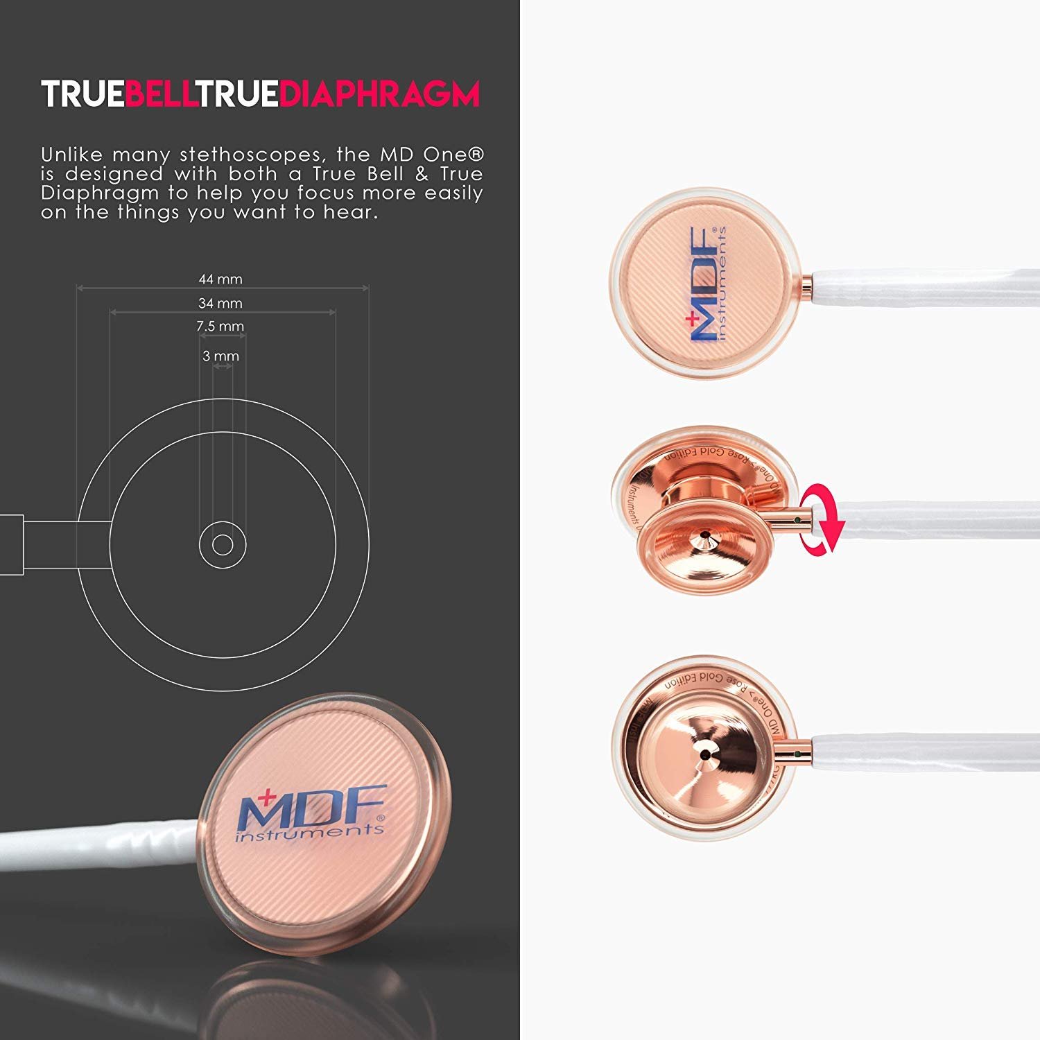 MDF MD One – Estetoscopio de acero inoxidable, adulto, tubo blanco, piezas torácicas y auriculares oro rosa, MDF777RG29